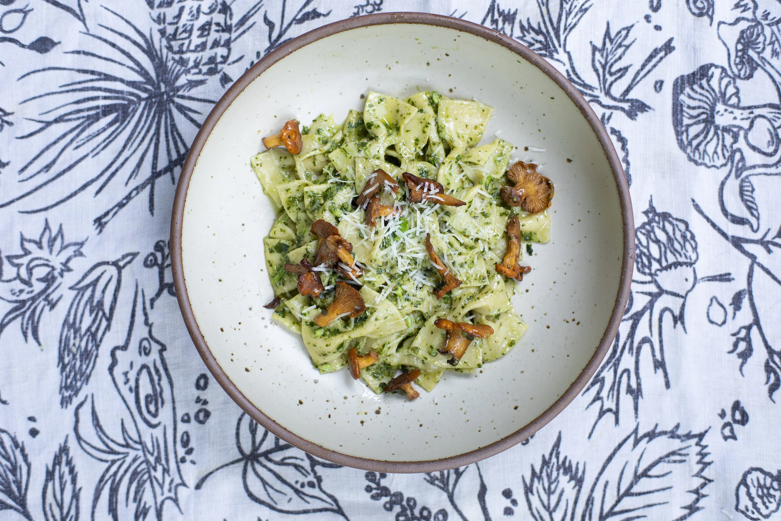 1. In a food processor, blitz together the ramp leaves and half of the heavy cream.