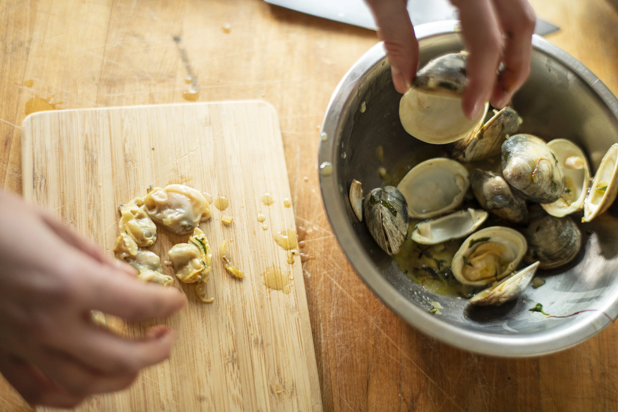Slice the guanciale very thin ribbons and cut into smaller pieces. On low heat, cook the guanciale until the fat renders out and it begins to crisp in the pan. Transfer to a small bowl and allow to cool. You can use bacon as a substitute here but guanciale is definitely preferred.